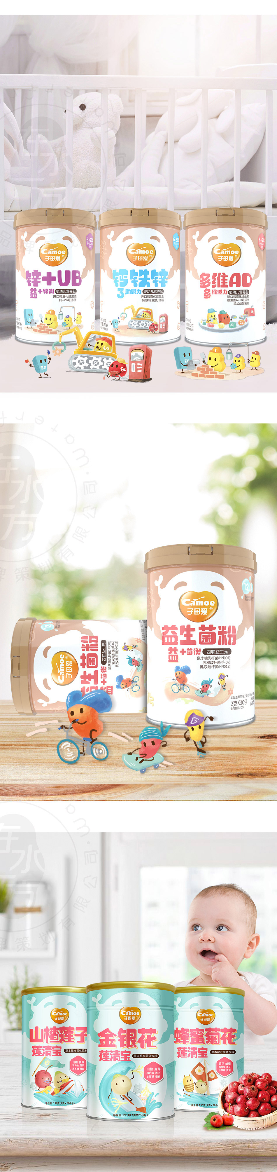 項目方案:子母愛品牌圍繞嬰童輔食營養(yǎng)品領(lǐng)域打造有情感有品質(zhì)有親和力的品牌形象,迎合當前年輕消費市場的審美和體驗需求,用原創(chuàng)性手繪風(fēng)格增加產(chǎn)品訴求力,提升陳列效果的同時也有助于品牌口碑和營銷的推進。