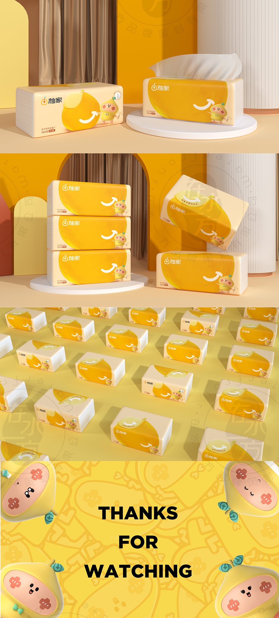 服務(wù)方案:進入2.0時代的柚家,擁有更為明確的品牌定位路線,以迎合精致家居消費為導(dǎo)向,全力推出一系列符合新消費市場的優(yōu)質(zhì)紙品。放大“家”的概念,引進柚子家族IP形象詮釋品牌對潔居生活的理解,用更為時尚有趣的方式展現(xiàn)健康品質(zhì),有助于品牌順利出圈。