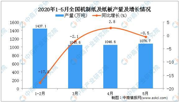 根據(jù)中國輕工業(yè)信息中心數(shù)據(jù)顯示,2020年1-5月,全國機(jī)制紙及紙板產(chǎn)量4636.2萬噸,同比下降6.8%。5月當(dāng)月,全國機(jī)制紙及紙板產(chǎn)量1076.7萬噸,同比下降0.5%。