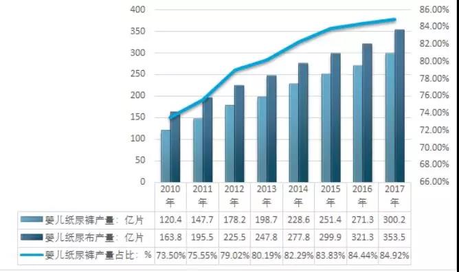 (2010-2017年中國嬰兒紙尿褲產(chǎn)量及占比情況)