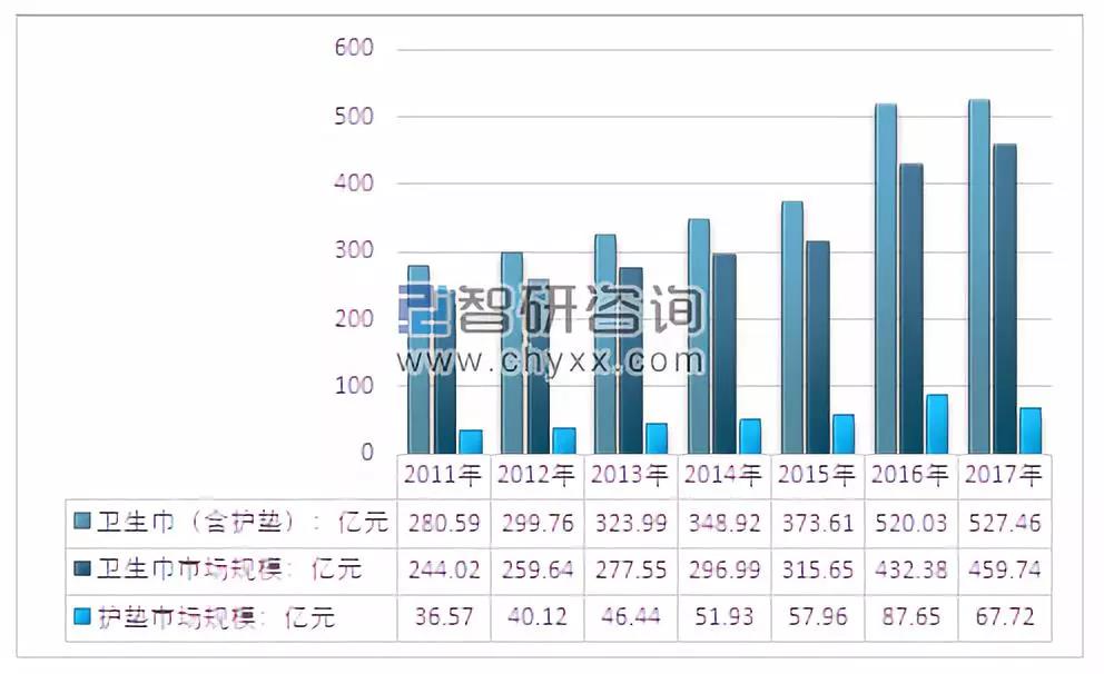 根據(jù)中國造紙協(xié)會(huì)生活用紙專業(yè)委員會(huì)的數(shù)據(jù),2011 年至2017年,衛(wèi)生巾(含護(hù)墊)消費(fèi)量從839.6億片增加到1200.1 億片,市場規(guī)模從280.59億元擴(kuò)大至527.46億元。