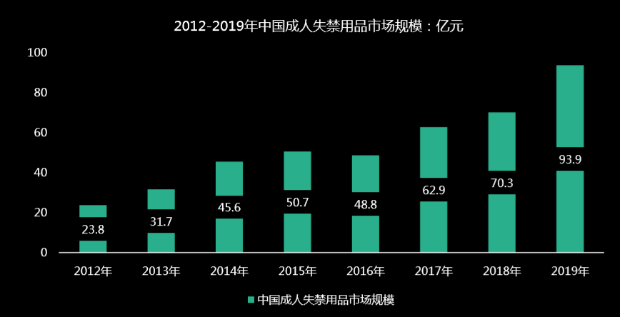 根據(jù)人口失禁發(fā)生率和人口結(jié)構(gòu)估算,中國失禁的人數(shù)在2-3億人,按照每人正常使用片單數(shù)去核算,這個群體的失禁用品規(guī)模應(yīng)該是現(xiàn)在實(shí)際的4-5倍(2019年中國成人失禁用品市場規(guī)模為93.9億元),這還是保守估算的結(jié)果。