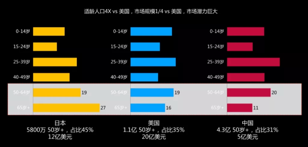 舉個例子,2017年中國50+人口是4.3億人,是美國同年50+人口的4倍(美國為1.1億),但是2017年中國中老年護(hù)理行業(yè)市場規(guī)模為5億美元,美國為20億美元。中國還有多大的市場潛力沒有釋放出來?