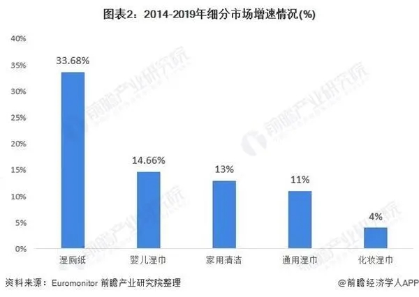 從細分品類看,嬰兒濕巾占據(jù)著我國濕巾的主要市場份額,占比超過一半。同時,嬰兒濕巾近年來發(fā)展增速較快,接近15%。不過,濕廁紙產品發(fā)展最快,增速高達33.68%。