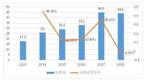 從消費量來看,2013年以來,我國成人失禁用品的消費量增長較為迅速,從2013年的 17.9億片增加至2018年的44.1億片,年均復(fù)合增長率達到19.8%。