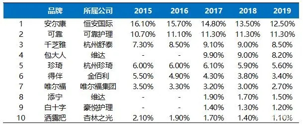 在企業(yè)數(shù)量上,2018年統(tǒng)計在冊的成人失禁用品生產(chǎn)企業(yè)有448家。本土廠商包括杭州可靠、恒安國際、豪悅護理等,外資廠商包括金佰利、尤妮佳等。目前成人失禁用品以國內(nèi)品牌為主,2019年國內(nèi)品牌恒安國際安爾康、杭州可靠、杭州舒泰千芝雅市占率分別為12.5%、11.3%、8.5%,占據(jù)前三。
