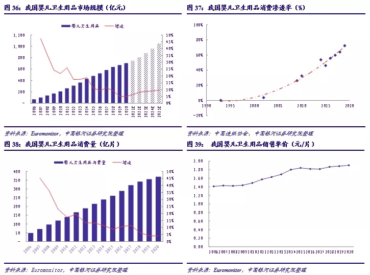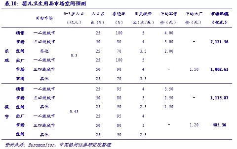 考慮到滲透率、日均使用量以及產(chǎn)品價格帶多種因素的差異,我們同樣按照不同地區(qū)劃分對嬰兒衛(wèi)生用品市場規(guī)模進(jìn)行了預(yù)測。其中因為0-3歲區(qū)間內(nèi)不同年齡段嬰兒的日均更換頻次不同,預(yù)測中進(jìn)行了取均數(shù)處理,通常新生兒每日應(yīng)該更換6-8次,隨著年齡的增長時間間隔可以逐步拉長。綜上,我們樂觀預(yù)期我國嬰兒衛(wèi)生用品的終端市場規(guī)模約2100億元,保守也可達(dá)到1100億元,較20年市場規(guī)模有60%-200%的提升空間;出廠價按照樂觀1.50元/片、保守1.20元/片的行情預(yù)測,出廠市場規(guī)模也可達(dá)到490-1000億元。