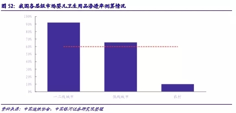 2.三四線城市以及農(nóng)村市場滲透率的提升。根據(jù)現(xiàn)有數(shù)據(jù)測算,各地的嬰兒衛(wèi)生用品滲透率存在明顯差異,三四線等中低消費等級城市與農(nóng)村地區(qū)嬰兒紙尿褲的滲透率仍然有待提升,由此可以帶來整體消費量的提升空間。