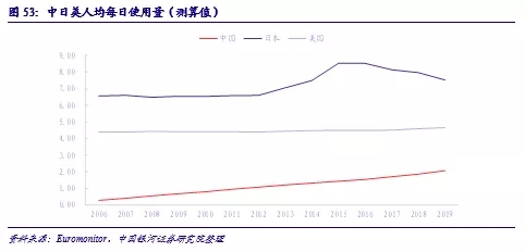 3.人均使用量的提升。伴隨著衛(wèi)生意識的提高,消費升級趨勢以及嬰兒衛(wèi)生用品新產(chǎn)品的更新?lián)Q代,家長們會更加注重紙尿褲安全性與舒適感,不斷提高使用更換頻次。根據(jù)測算,日本市場出現(xiàn)波動前每個適齡嬰幼兒(0-3歲)的每日使用量約為6.5片,美國市場的長期均值水平為4.5片/日;對比之下,盡管出現(xiàn)提升趨勢,我國當(dāng)前的人均使用量為2片/日,較發(fā)達(dá)成熟市場存在較大差距,未來有望進(jìn)一步提升至4-6片/日的區(qū)間內(nèi)。