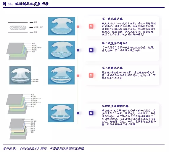 自香港的瑞德國際旗下品牌Fitti菲比(1992年),以及金佰利旗下品牌好奇(1994年)進(jìn)入中國大陸市場,我國嬰兒衛(wèi)生用品行業(yè)經(jīng)歷了快速發(fā)展,產(chǎn)品在材質(zhì)、結(jié)構(gòu)等層面不斷迭代更新。行業(yè)整體與其核心——芯體的發(fā)展歷程相近,以2006年為階段性節(jié)點,在此之前,我國的嬰兒衛(wèi)生用品行業(yè)以外資品牌為主,好奇、幫寶適、媽咪寶貝等國際品牌集中進(jìn)入中國市場,產(chǎn)品芯體雖有結(jié)構(gòu)分區(qū)的變化,但以絨毛漿和SAP材質(zhì)為主導(dǎo);2006年不含絨毛漿的復(fù)合芯體結(jié)構(gòu)出現(xiàn),此后國內(nèi)品牌大舉擴(kuò)張,市場內(nèi)多品牌混戰(zhàn)。