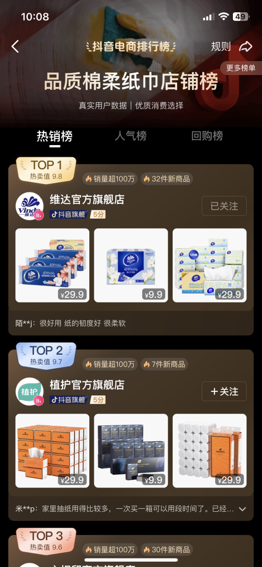 以生活用紙品牌維達(dá)為例,截至2023年7月25日,據(jù)抖音平臺直播動態(tài)顯示,維達(dá)官方旗艦店今年上半年累計直播場次已超過200場。從最新的抖音電商排行榜來看,維達(dá)官方旗艦店已經(jīng)在“品質(zhì)綿柔紙巾店鋪熱銷榜”上排名第一。而店內(nèi)居銷量榜首的爆品手帕紙更是售出達(dá)到253.6萬件。其中排名前五的品類分別為手帕紙、卷芯紙和抽紙,手帕紙獨(dú)占前三名。