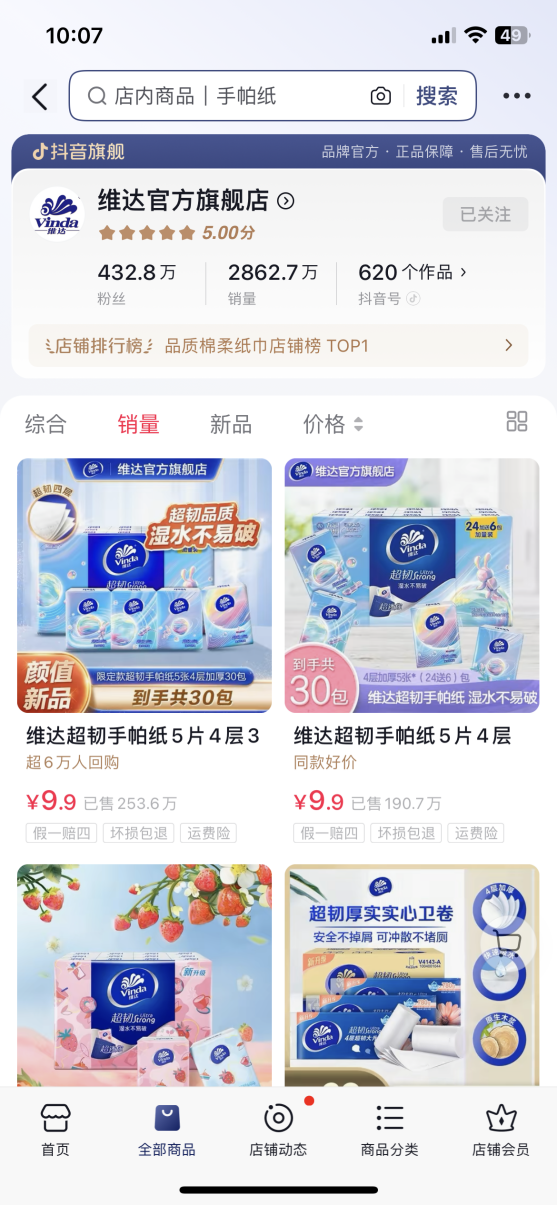 其中以抖音電商為例,維達(dá)在抖音設(shè)立的旗艦店已經(jīng)擁有粉絲432.8萬,累計獲贊138.5萬,并發(fā)布了620個推廣作品,對應(yīng)上架商品多達(dá)579件。