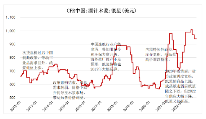 然而,針對木漿這一原材料,生活用紙企業(yè)非常被動。據(jù)方正中期期貨數(shù)據(jù)顯示,我們可以在下表的漂針木漿(銀星)CFR現(xiàn)貨價走勢中發(fā)現(xiàn),從2012年到2022年,木漿價格整體攀升幅度非常大,同時波動明顯。直到2022年,木漿現(xiàn)貨價格達(dá)到歷史高位。由此可見,生活用紙企業(yè)在囤積原材料方面壓力不小。