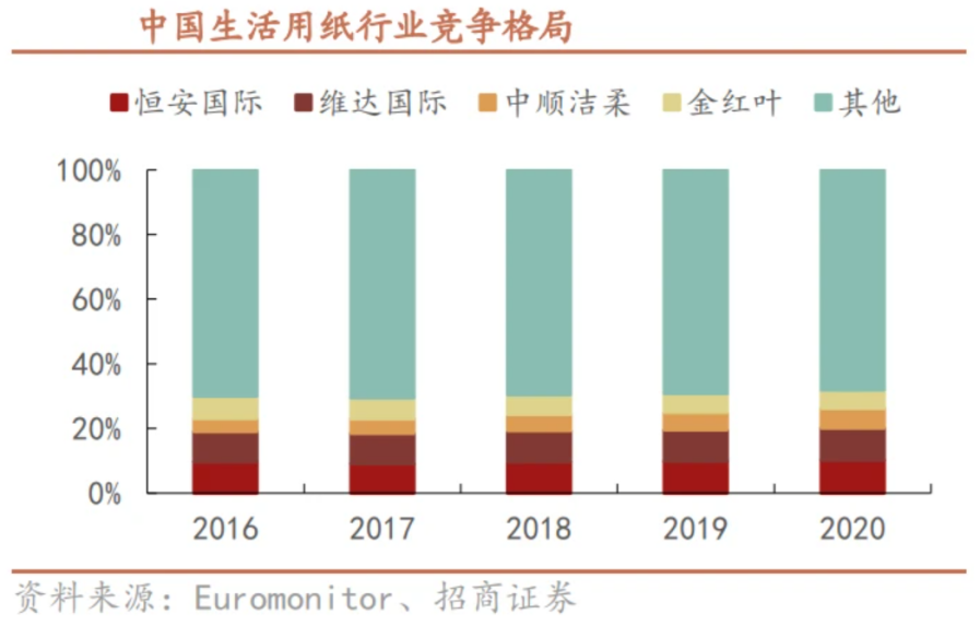 據(jù)招商證券研報顯示,2020 年中國生活用紙行業(yè)四巨頭恒安國際、維達(dá)國際、中順潔柔、金紅葉的市場占有率分別為 10.2%、10.0%、6.0%、5.7%,但行業(yè) CR4 僅為 31.9%,集中度仍有提升空間。那么,占據(jù)頭部一席的維達(dá)國際在提升市場份額上還能做些什么?