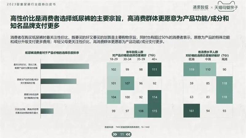 根據(jù)白皮書數(shù)據(jù)顯示,消費者在購買紙尿褲時最關注性價比,“又好又劃算”是主要購物宗旨,同時也有超過50%的消費者表示,愿意為產品的特殊功能和成分升級支付更多費用:年輕父母更關注性價比,高消費群體更愿意為產品功能/成分支付更多。