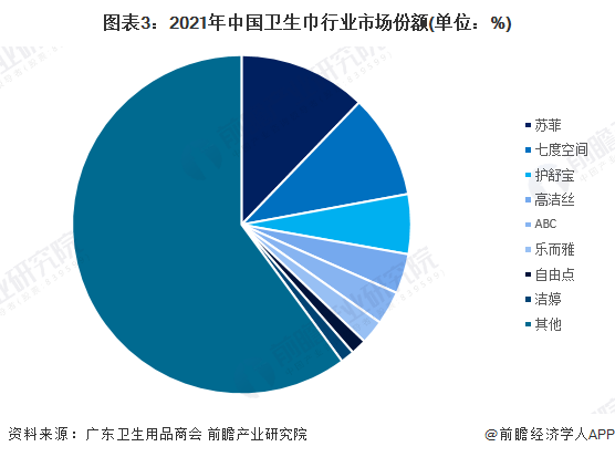 數(shù)據(jù)顯示,2021年中國(guó)衛(wèi)生巾行業(yè)市場(chǎng)份額前三的品牌分別是蘇菲、七度空間以及護(hù)舒寶,市場(chǎng)份額分別為12%、10%和6%。衛(wèi)生巾行業(yè)品牌數(shù)量眾多,頭部品牌市場(chǎng)份額相對(duì)較小。