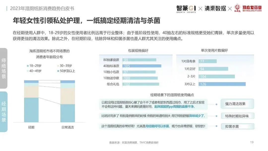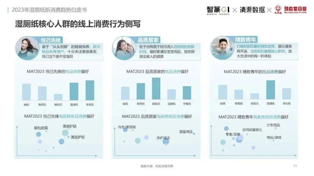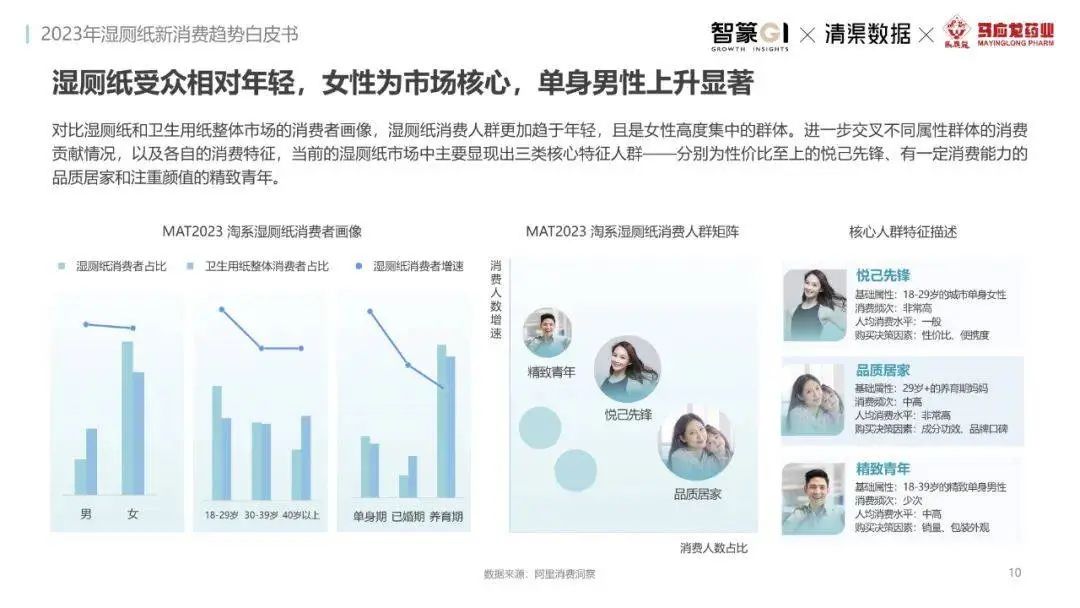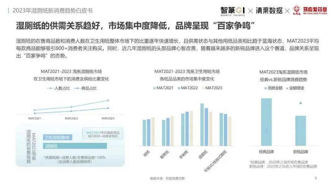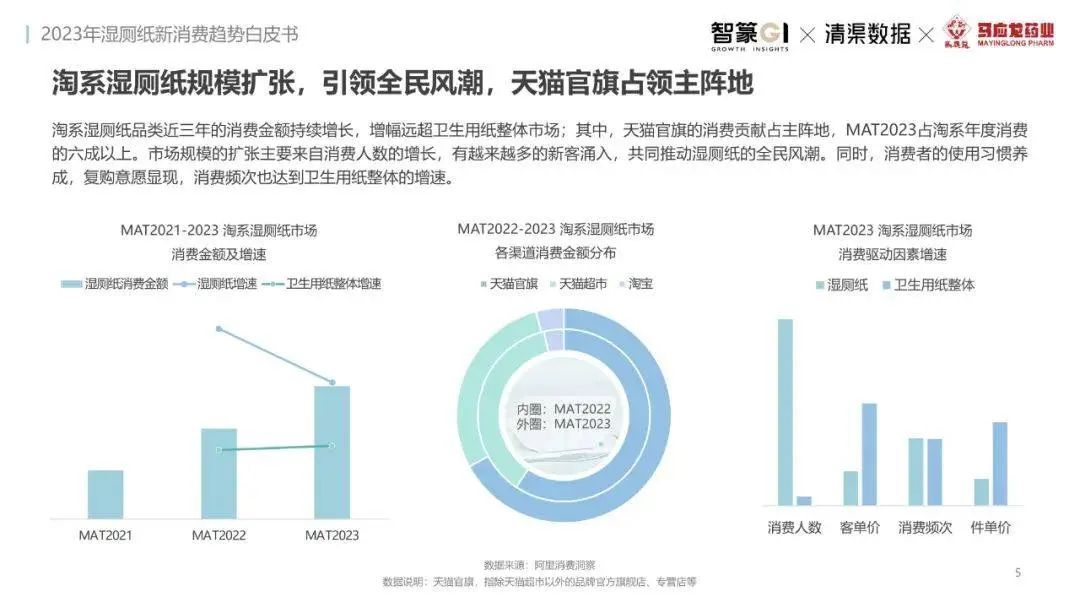 淘系濕廁紙品類近三年的消費(fèi)金額持續(xù)增長,增幅遠(yuǎn)超衛(wèi)生用紙整體市場(chǎng),其中,天貓官旗的消費(fèi)責(zé)獻(xiàn)占主陣地,MAT2023占淘系年度消費(fèi)的六成以上,市場(chǎng)規(guī)模的擴(kuò)張主要來自消費(fèi)人數(shù)的增長,有越來越多的新客涌入,共同推動(dòng)溫廁紙的全民風(fēng)潮,同時(shí),消費(fèi)者的使用習(xí)慣養(yǎng)成,復(fù)購意愿顯現(xiàn),消費(fèi)頻次也達(dá)到衛(wèi)生用紙整體的增速。