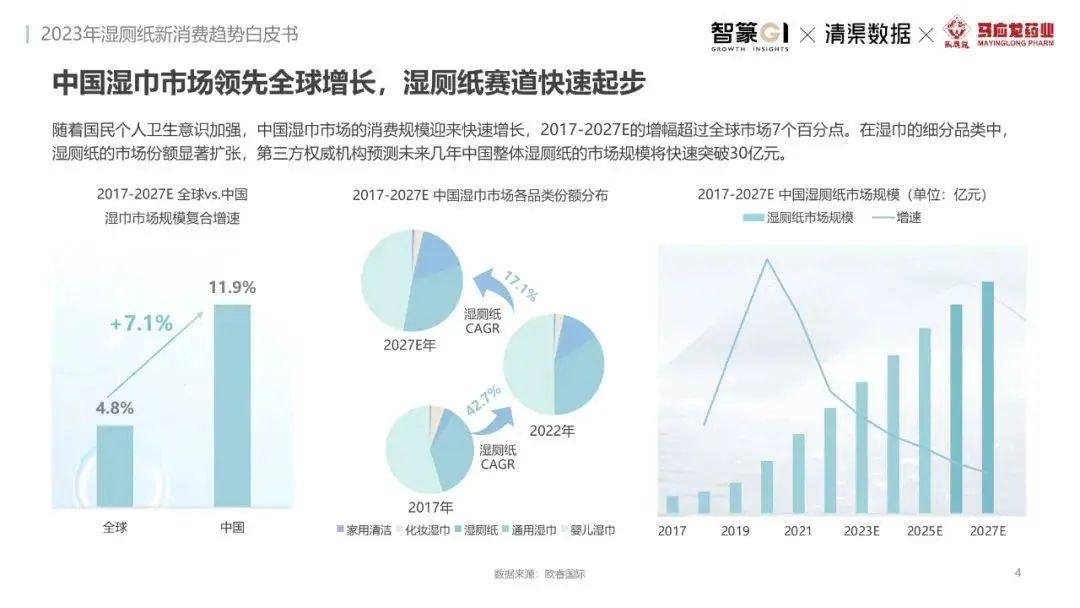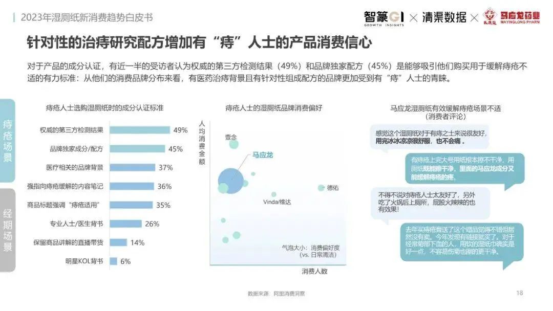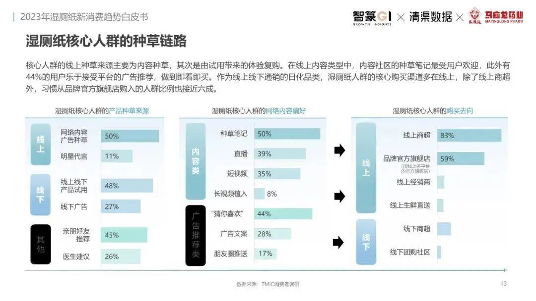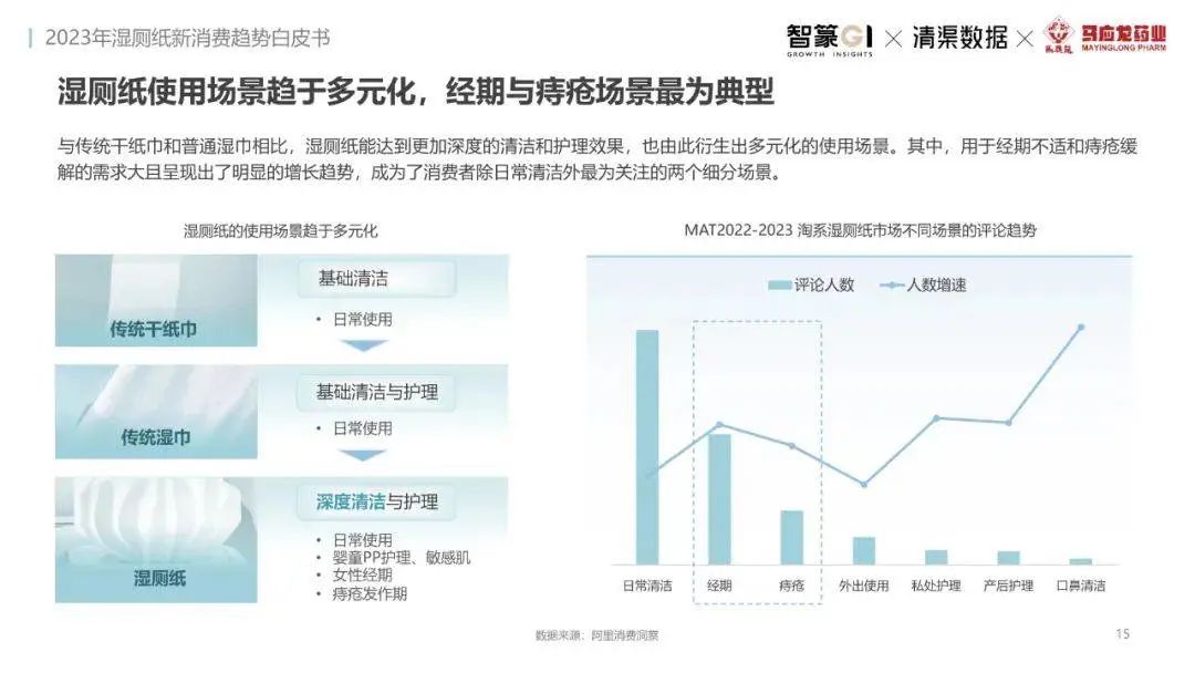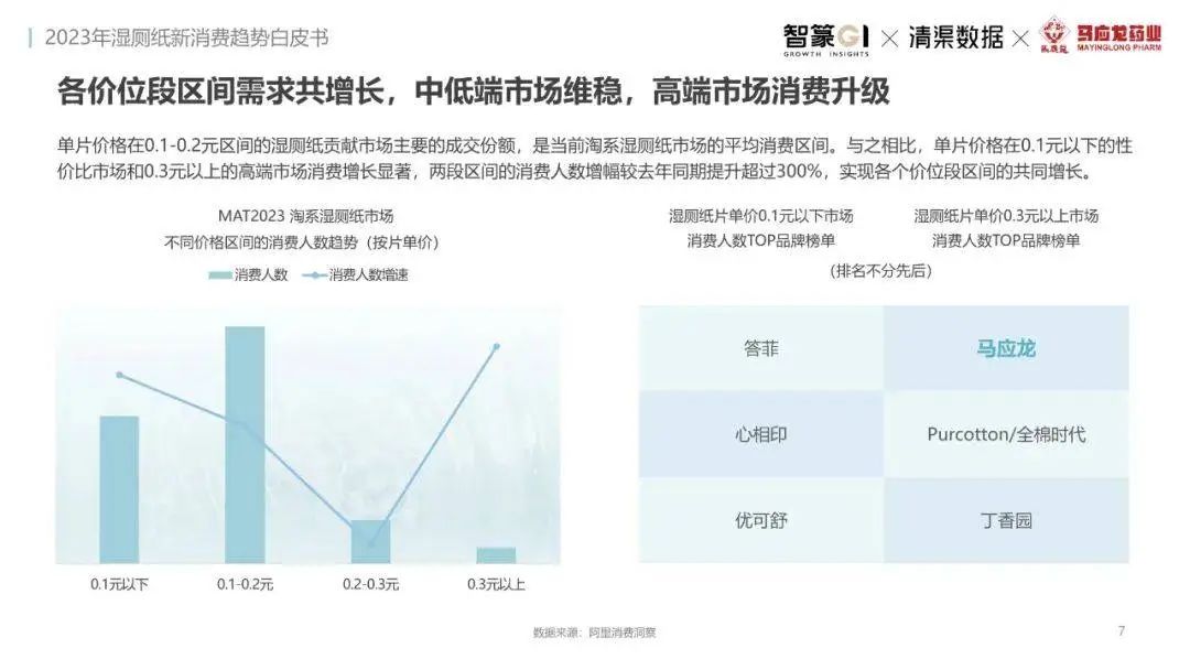 淘系濕廁紙品類近三年的消費(fèi)金額持續(xù)增長,增幅遠(yuǎn)超衛(wèi)生用紙整體市場(chǎng),其中,天貓官旗的消費(fèi)責(zé)獻(xiàn)占主陣地,MAT2023占淘系年度消費(fèi)的六成以上,市場(chǎng)規(guī)模的擴(kuò)張主要來自消費(fèi)人數(shù)的增長,有越來越多的新客涌入,共同推動(dòng)溫廁紙的全民風(fēng)潮,同時(shí),消費(fèi)者的使用習(xí)慣養(yǎng)成,復(fù)購意愿顯現(xiàn),消費(fèi)頻次也達(dá)到衛(wèi)生用紙整體的增速。